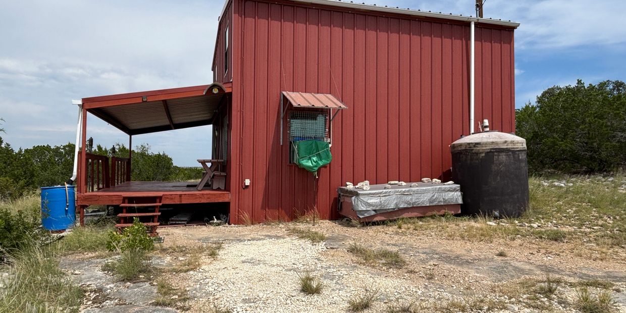 Enjoy the breathtaking views from the porch of this newly constructed cabin, sitting on 64.30 acres. End of the road property so NO traffic! The metal cabin is a 1/1 with sleeping area in loft. Electricity, septic, and water catchment system are in place. An additional water source of community well is nearby. The terrain is fairly mountainous, offering the most spectacular views of the beautiful Texas Hill Country. Moderate to heavy cover of Oaks, Cedar, Persimmon and Agarita. Wildlife in the area consists of Whitetail, Turkey, Axis, Hogs, Dove, with an occasional Aoudad. Ag exemption is in place. This property has been very lightly hunted for last few years. End of the road privacy. $350,000